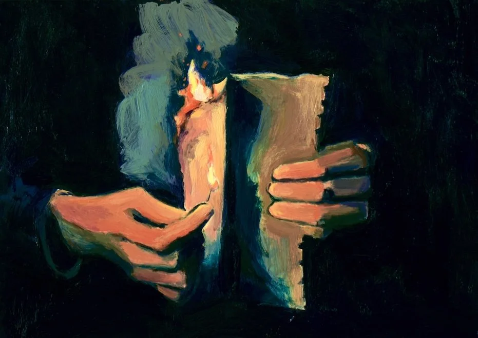 Apparently Lauren Sobka November 15, 2023 The weird of winter settling in.A recent painting revolving around some of my favorite themes - hands and setting paper on fire. (Apparently. Exhibit a, b & c.) Wonder what that says about me.Collect a print here.